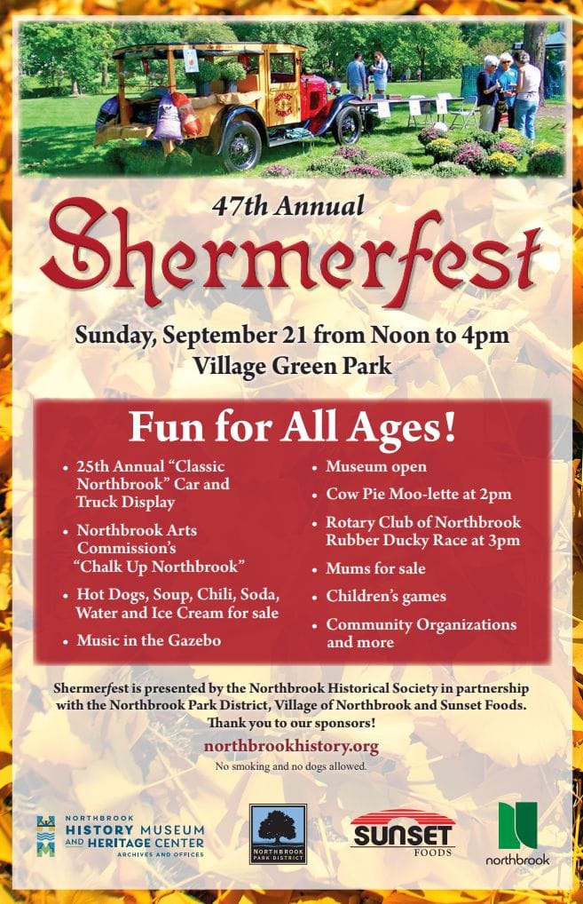 The Northbrook Historical Society cordially invites you to the 48th Annual Shermerfest on Sunday, September 20th, 2026 from Noon to 4pm in the Village Green Park and inside the Northbrook History Museum located at 1776 Walters Ave.